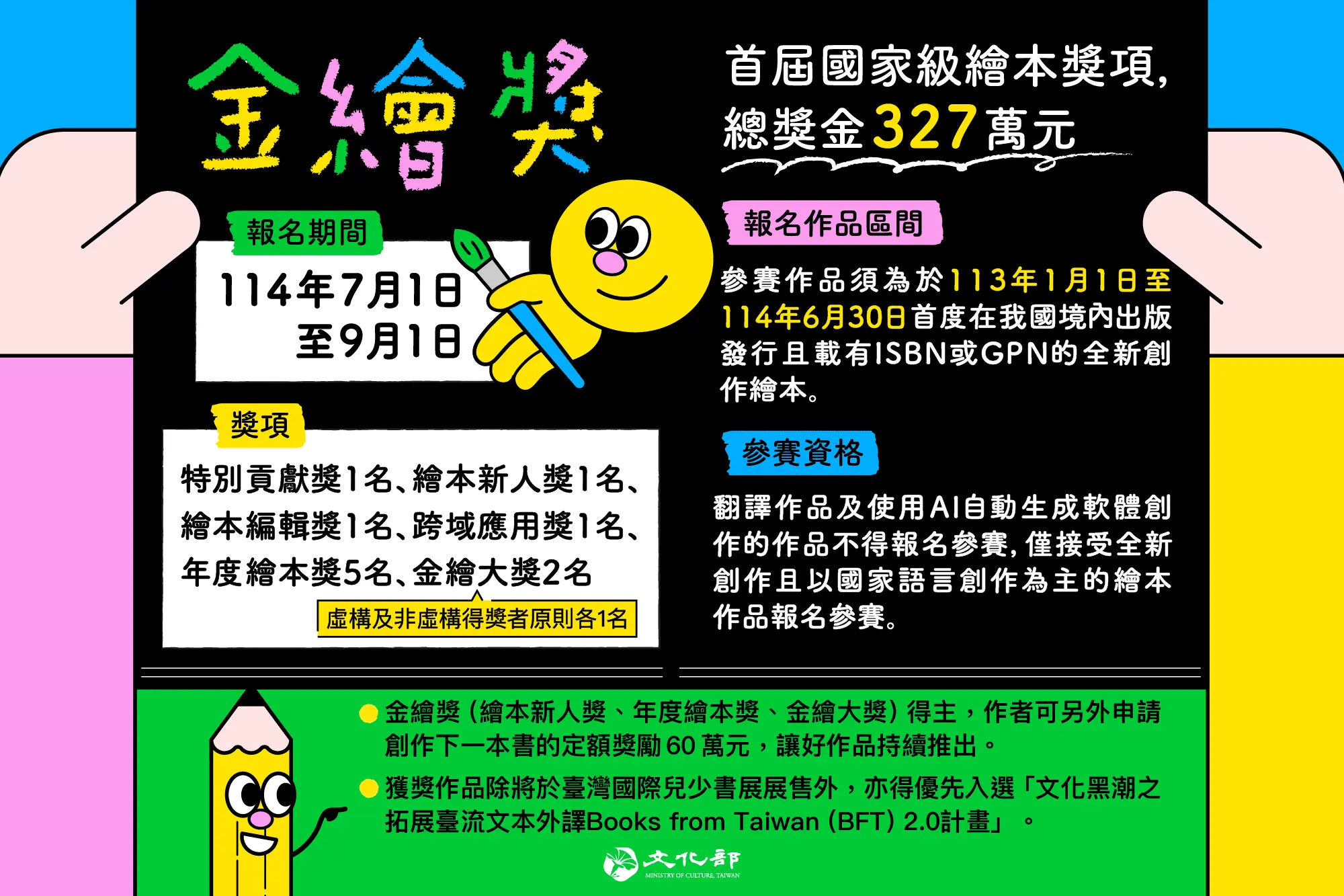 為支持我國原創繪本發展,文化部25日公布,在原有的國家級「出版三金」金鼎獎、金漫獎、金典獎外,新增設立國家級繪本獎項「金繪獎」。首屆徵件自7月1日起至9月1日受理報名,6大獎項總獎金新臺幣327萬元,歡迎繪本創作者及出版社踴躍報名。