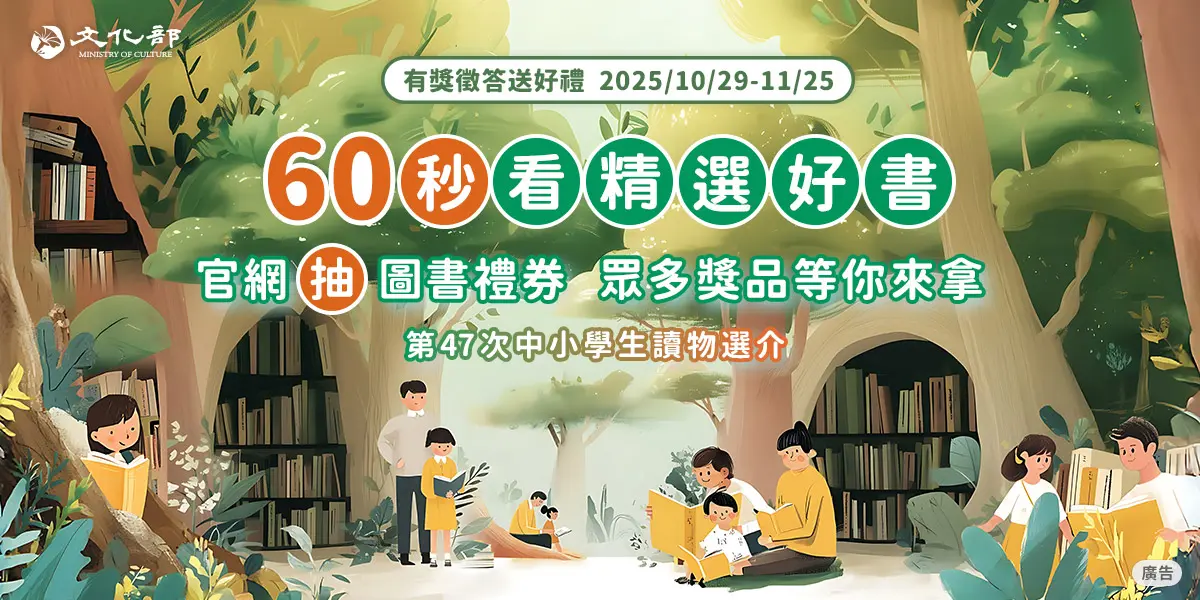 除了線上活動,文化部更深入校園與社區,規劃3大實體推廣形式,包含全臺20場「主題書展」,由各校量身打造閱讀專區;5場「校園講座」,邀請獲選書籍作者與學生面對面交流,分享創作歷程與閱讀啟發;5場「閱讀推廣行動站」,搭配校園活動設置互動展攤,讓學生與家長共同體驗閱讀的樂趣。相關資訊請見活動官網及FB粉專專頁,歡迎全國師生與家長共襄盛舉。