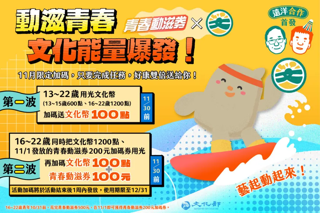 文化部表示,加碼送的文化幣與青春動滋券,預計於11月30日活動結束後1周內發放,使用期限一樣至今年12月31日止,鼓勵青年朋友把握最後2個月,趕快使用手中的文化幣與青春動滋券,也趁最後加碼機會,讓青春能量一路延燒到年底。