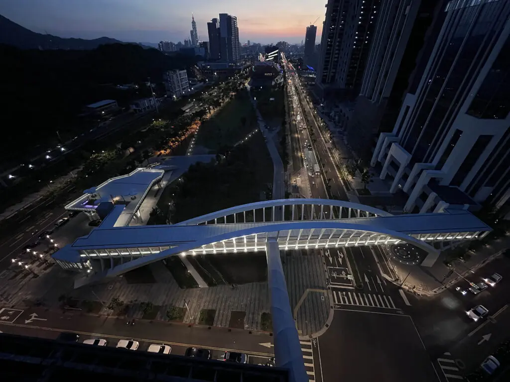 最後,「南港立體連通平台」和「BRUN TIANMU」二件入圍作品,則分別透過燈光回應都市生活的紋理。「南港立體連通平台」以南港車站為核心,串聯周邊的捷運站、商業區、公園及建築的立體人行系統。照明設計以使用者視角與行走友善體驗為優先,於橋體內部、階梯與平台設置嵌入式或隱藏式燈具,避免燈具外露造成行人碰觸或視覺干擾;欄杆與邊緣照明以間接打光為主,提供柔和光源並有效控制眩光與光害。透過燈光營造出富有特色的夜間視覺焦點,打造一個安全且無壓迫感的通行環境。