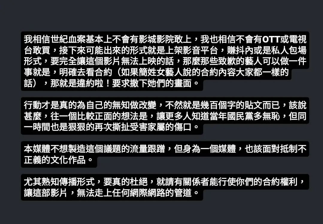 相信世紀血案基本上不會有影城影院敢上,我也相信不會有OTT或電視台敢買,接下來可能出來的形式就是上架影音平台,賺抖內或是私人包場形式,要完全讓這個影片無法上映的話,那麼那些致歉的藝人可以做一件事就是,明確去看合約(如果簡姓女藝人說的合約內容大家都一樣的話),那就是違約啦!要求撤下她們的畫面。