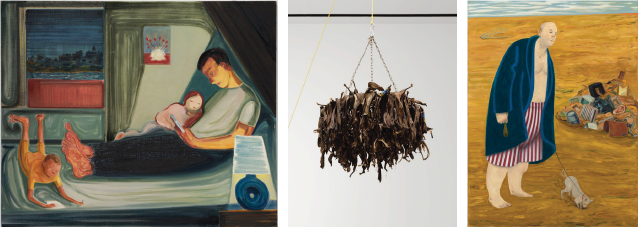 尼可・艾森曼(Nicole Eisenman)的個展「墮落天使」(Fallen Angels),就像標題中落入凡間的天使一般, 是她近年來最為入世、最貼近生活的一次呈現。展覽涵蓋十一幅近期繪畫與三件雕塑,主要聚焦於三個中產生活的典型場所:家庭、工作與海灘。展出的畫作幾乎全為架上尺寸,而其中的兩件雕塑(取材自艾森曼工作室裡的桌子與椅子)即使脫離了原本的使用場景,仍帶給人一種不經意的現成品(readymade)之感。這些作品尺幅的收斂與靜謐的基調,與藝術家以往擁擠群像和充滿社會諷喻的風格形成了鮮明的對比,但它們同樣不容小覷。在這裡,人物徘徊、猶疑、自我反覆,時間彷彿在熟悉的空間中凝滯。畫面追求的並非製造視覺奇觀, 而在於凝視,在於持續直面近在眼前之物的考驗。前兩個場所(家庭和工作)已彼此坍塌、融為一體,第三個(海灘)也未提供任何逃離的出路。
