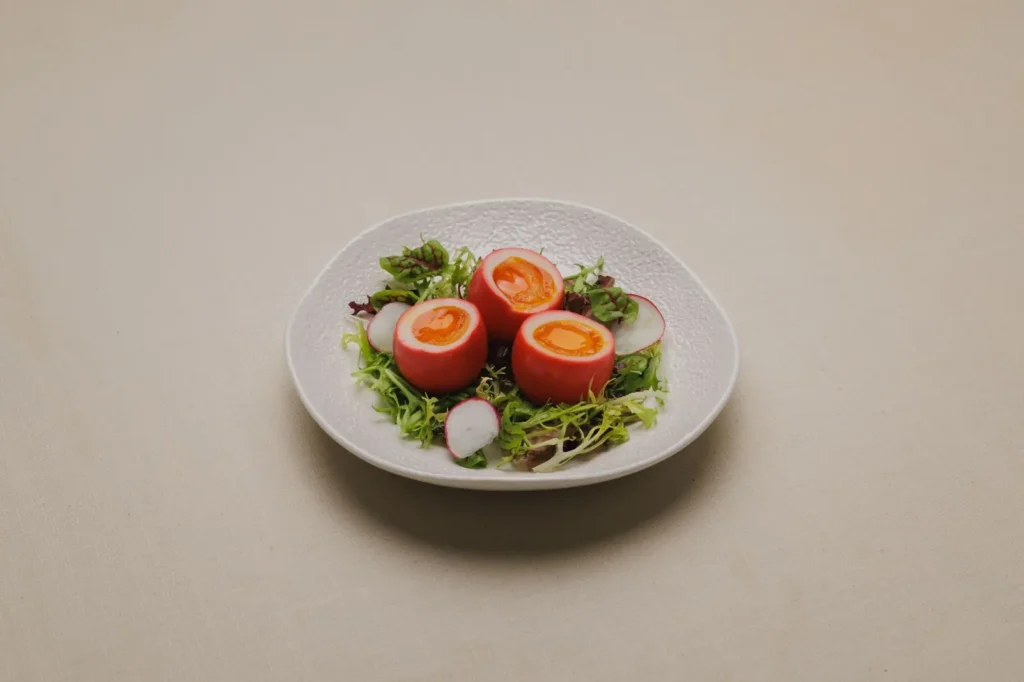 特色小食「酒香黃金蛋」特別選用白殼紅心的有機機能蛋,浸泡在由雞湯、花雕酒與紅糟調製而成的秘製滷汁中長達兩天。外皮的鮮紅色澤吸睛,一口咬下能同時嗅到蛋白融合了酒香與紅糟香氣,溏心蛋黃增添厚實口感,酒香濃郁餘韻悠長。