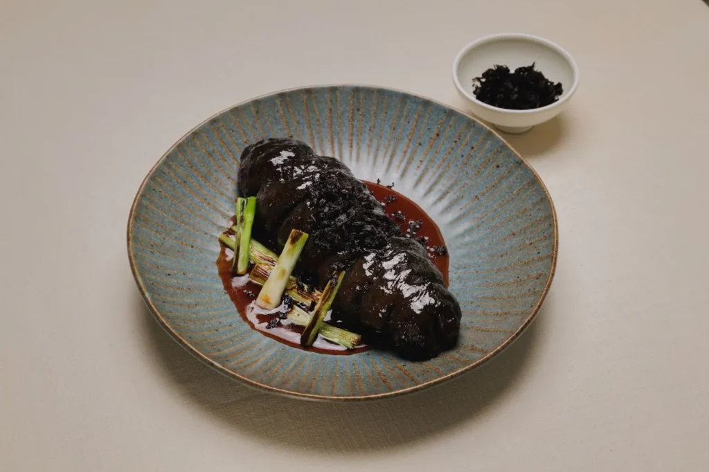 主打菜色「梅菜海參」選用厚實的豬婆參,注入彈牙的手打蝦滑後先煎熟定型,再加入香醇鮑汁與紹興梅乾菜煨煮滷製,展現繁複的職人工藝。出餐前撒上特製的炸梅乾菜酥,讓柔軟糯口的海參、Q 彈蝦滑與濃縮後的梅菜醬香交織出驚艷的層次感。