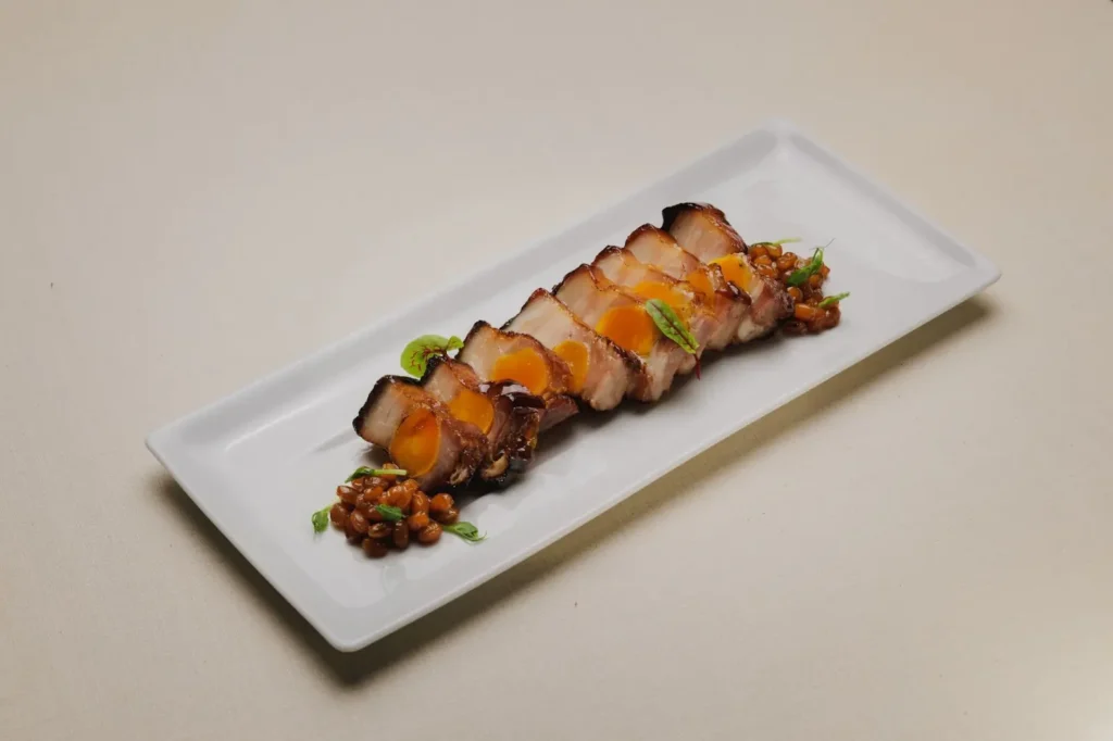 涼菜🌟「黃金黑叉燒」尤屬翻玩經典菜色的代表,主廚 Denny 選用油脂更為豐潤的五花肉,取代傳統叉燒常見的梅花肉,並於肉心塞入鹹蛋黃,慢烤一小時後再以大火收乾,賦予焦糖化表皮的色澤與香氣。入口時焦糖香與蛋黃鹹甜交織,搭配蜜黃豆更顯風味。